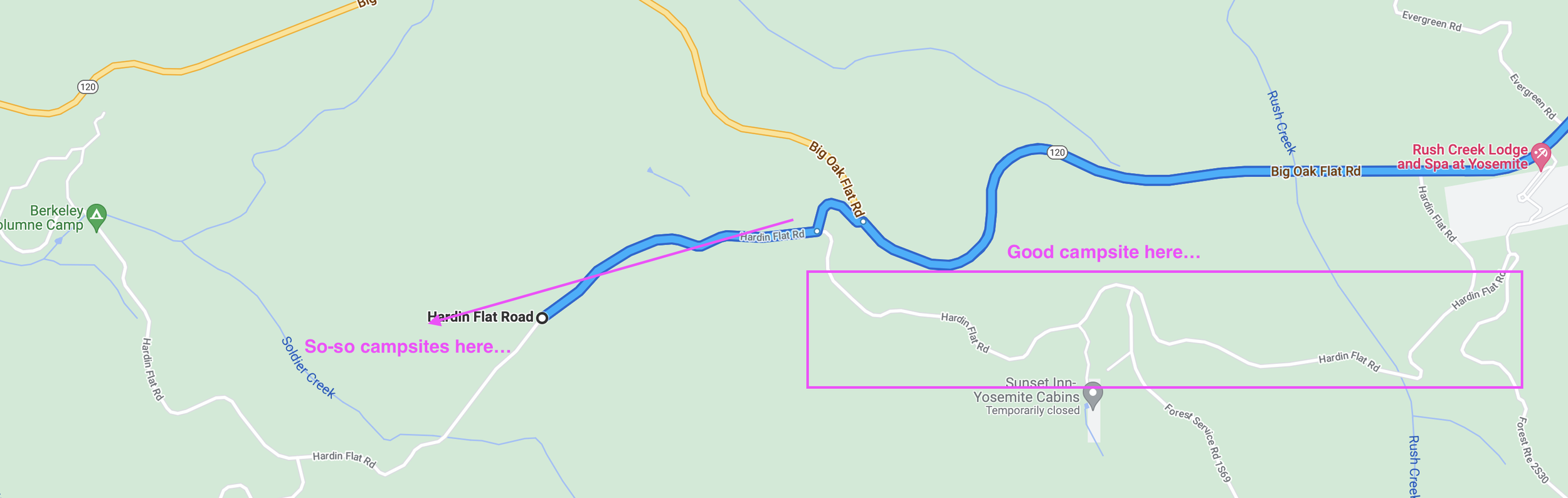 As we headed East on Hardin Flat Road, we discovered our mistake the previous day. The worthy campsites (not that ours wasn’t) are all located East of Golden Arrow Rd. and West of Big Oak Flat Road. If you’re headed to the area to camp, use the Rush Creek Lodge entrance to Hardin Flat Rd. and work your way westward until you find something to your liking. There are also a number of forest service roads off Hardin Flat that will take you deeper into the Stanislaus National Forest. (We didn’t explore much in that direction, so no comment on potential campsites.)